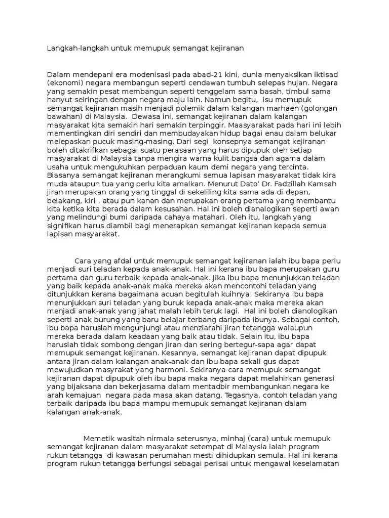Contoh karangan usaha dan langkah memupuk semangat kejiranan dalam kalangan masyarakat. Kelunturan semangat kejiranan dalam kalangan masyarakat pada era globalisasi yang semakin canggih amat membimbangkan kerana bakal menjejaskan struktur sosial . Contoh karangan spm karangan dimensi masyarakat/negara semangat kejiranan dalam kalangan rakyat di negara ini semakin longgar. Tradisi kejiranan dalam masyarakat (langkah memupuk semangat kejiranan). Dalam menempuh era dunia kemajuan dan kemodenan ini, kita sebagai individu yang hidup dalam kelompok masyarakat kian mengabaikan . Semangat kejiranan dalam kalangan masyarakat . Untuk memupuk semangat kejiranan dalam kalangan masyarakat setempat. Contoh karangan cara mengeratkan hubungan sesama jiran. Namun begitu, isu memupuk semangat kejiranan masih. Masyarakat di malaysia terutamanya dalam kalangan remaja seharusnya mengamalkan sikap bahu membahu supaya boleh mewujudkan semangat kejiranan.